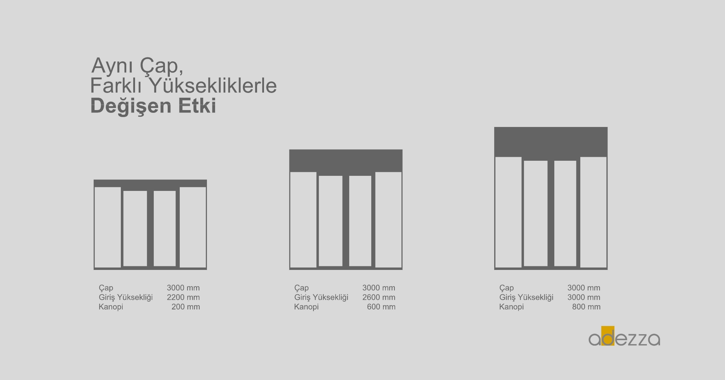 Döner kapılarda çap sabit kalsa bile, yükseklik arttıkça kapının mimarideki varlığı değişir. Aynı 3 metre çap; daha yüksek giriş ve kanopi yapısıyla çok daha heybetli, karizmatik ve prestijli bir görünüm sunar. Bu, yalnızca ölçü farkı değil; yapının giriş algısını tamamen yeniden tanımlayan bir mimari duruştur.