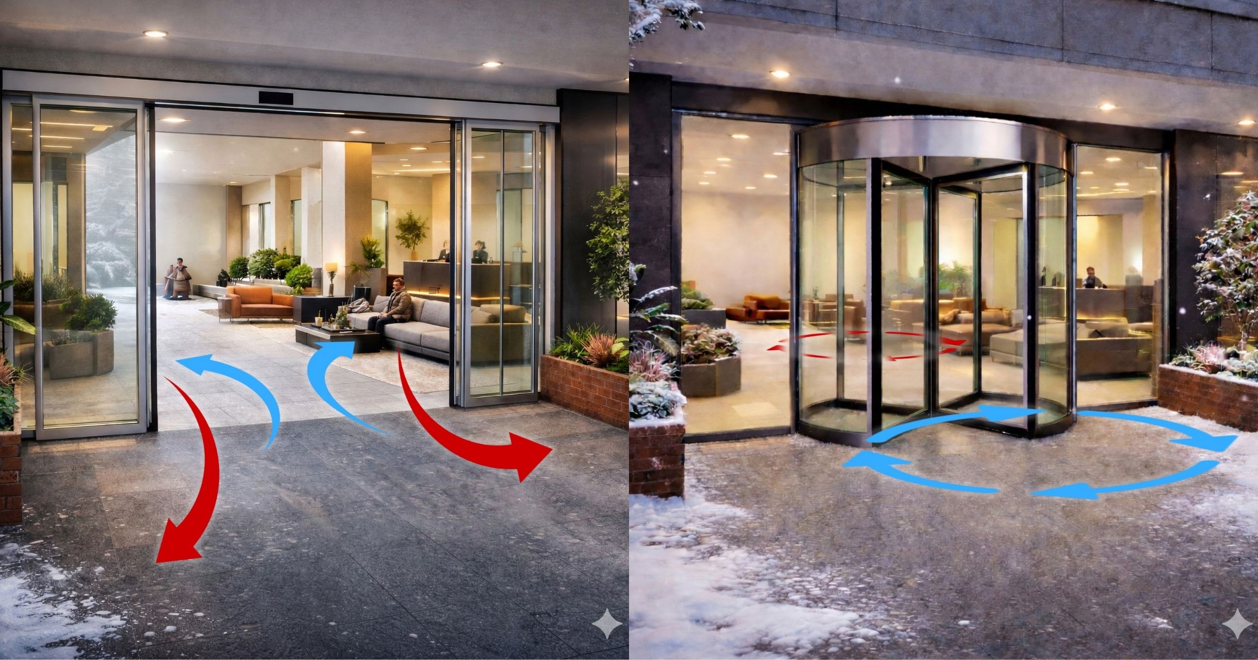 Yüksek hacimli yapılarda oluşan basınç farkı ve rüzgar etkisi, klasik kapılarda hava sirkülasyonunu artırır. Döner kapılar bu hava akışını sınırlandırarak iç ortamın stabil kalmasına yardımcı olur.
