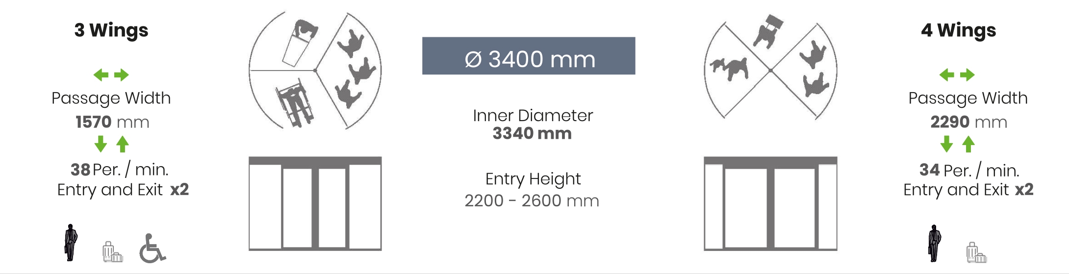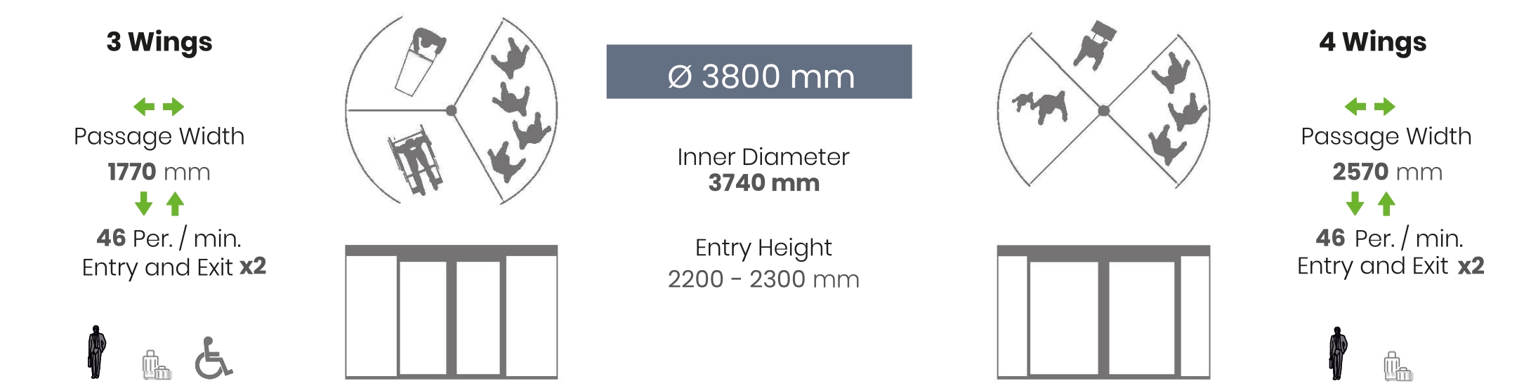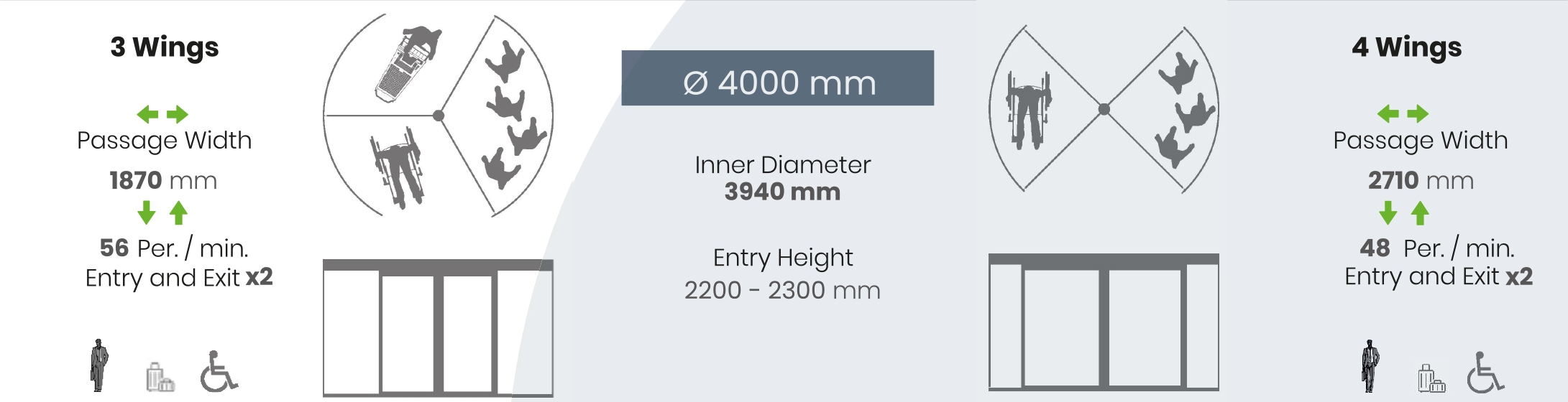 | Security | Radar | 3 Wings Ø 1800 mm – Ø 3600 mm One unit at entrance and exit 3 Wings Ø 3601 mm – Ø 4000 mm Two units at entrance and exit | – |