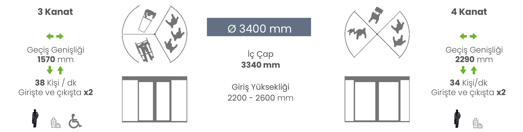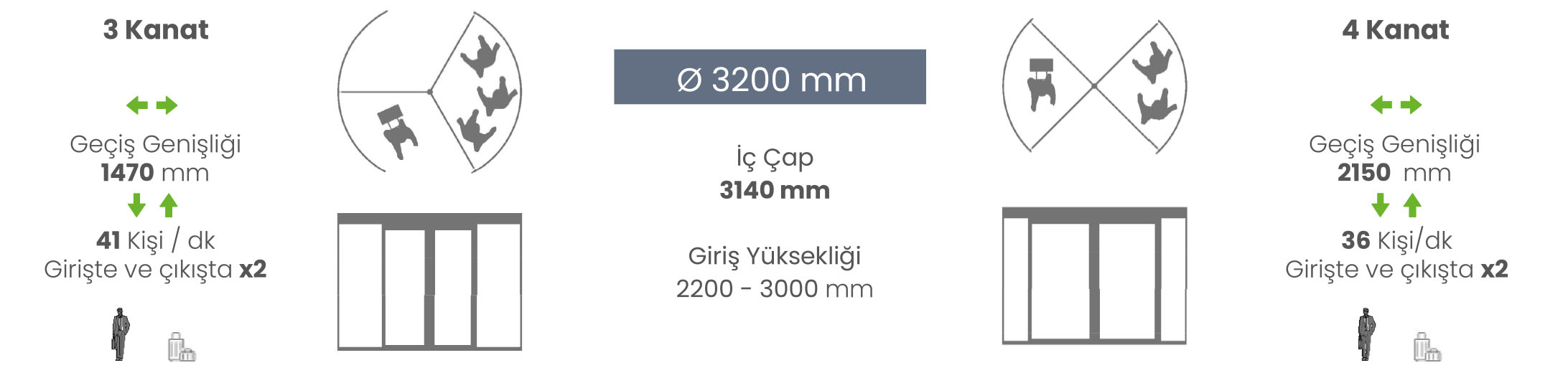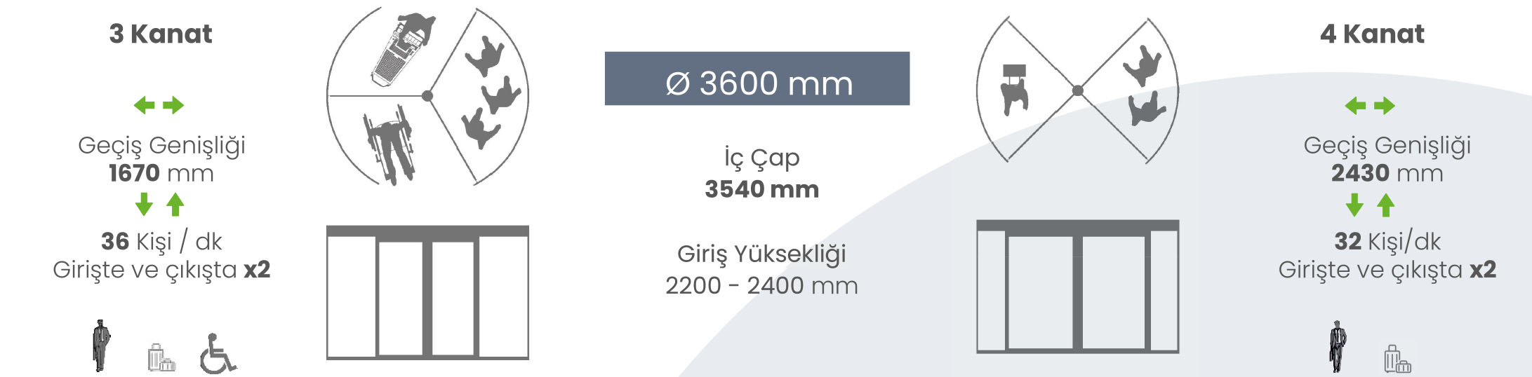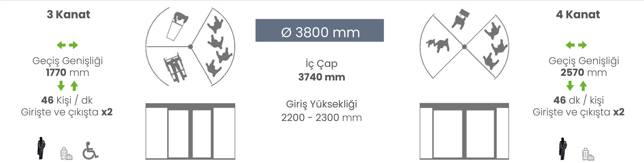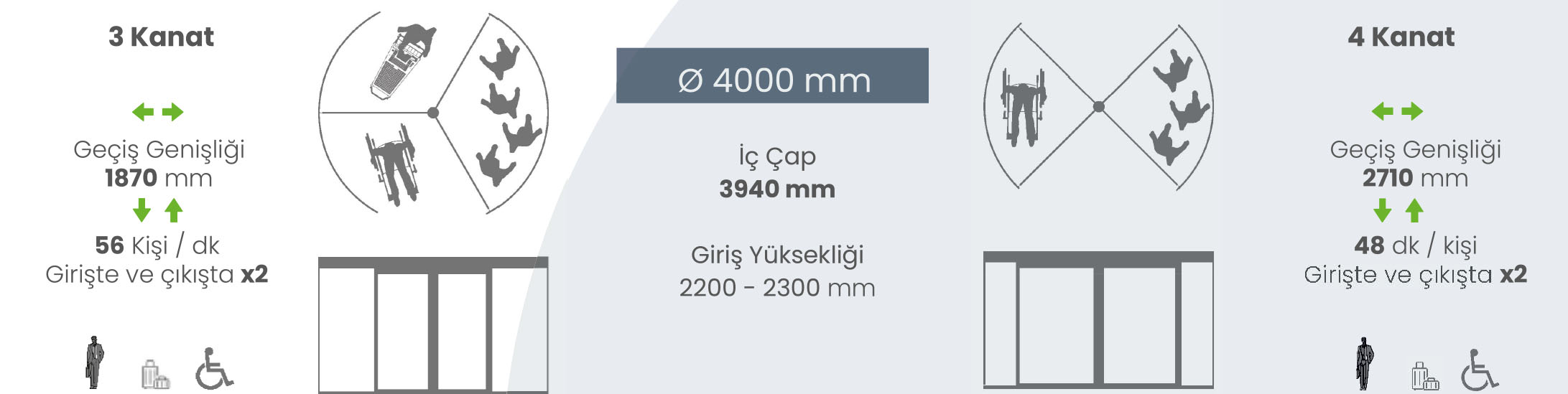 Farklı çap, giriş yüksekliği, cam ve kanat seçenekleriyle her bina tipine ve mimari stile uyum sağlayan döner kapılarımız, girişlerde prestijli bir görünüm oluşturur.